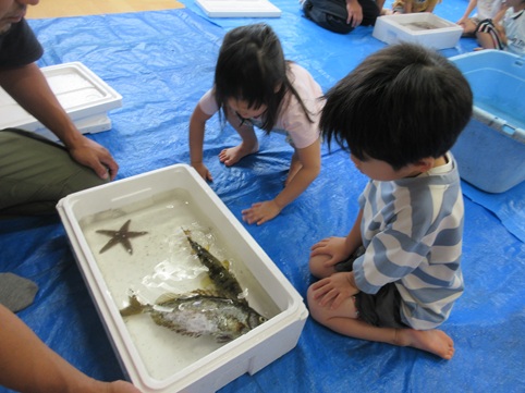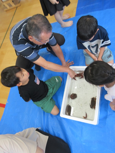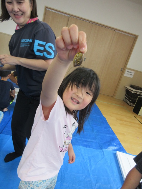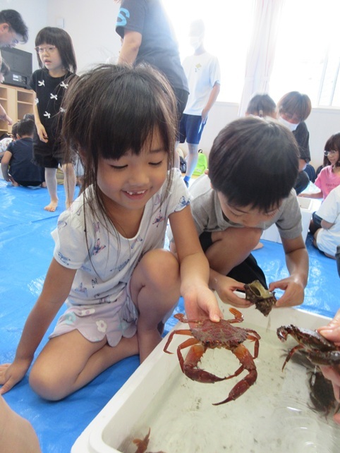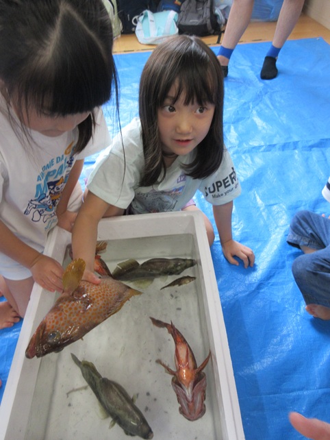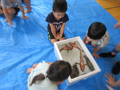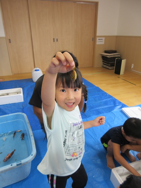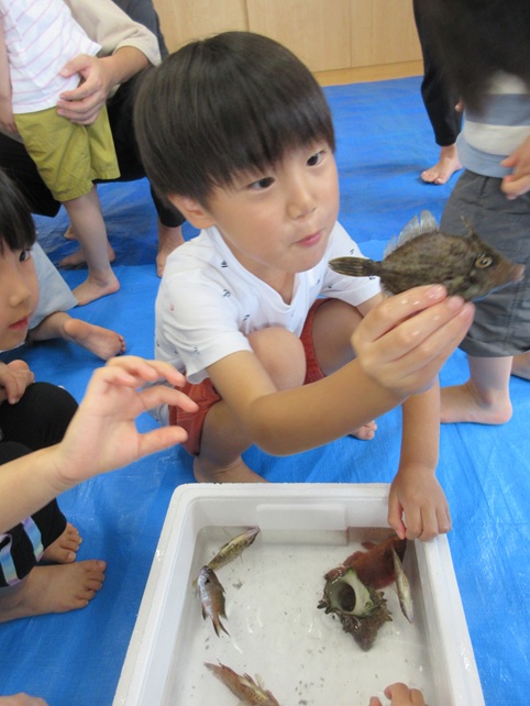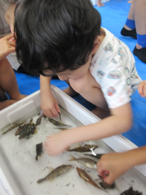 すぐに魚に触ろうとする姿や少しこわがる姿などいろいろな姿がありましたが、実際に魚を触る体験は良い経験となりお迎えの際にはすぐに親御さんにお話をしていました