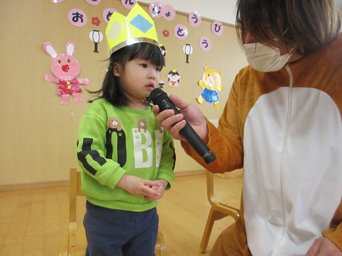 次は、ぱんだ組のお友だちにインタビュー「何をして遊ぶのが好き?」「おえかきをすることが好きです!」