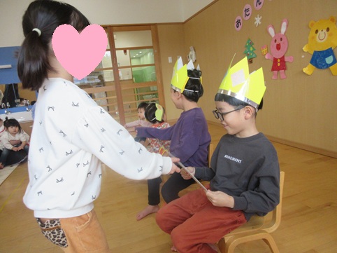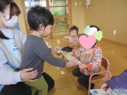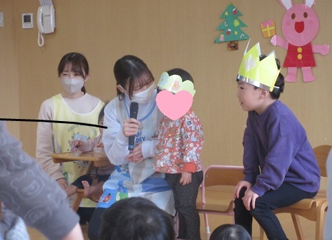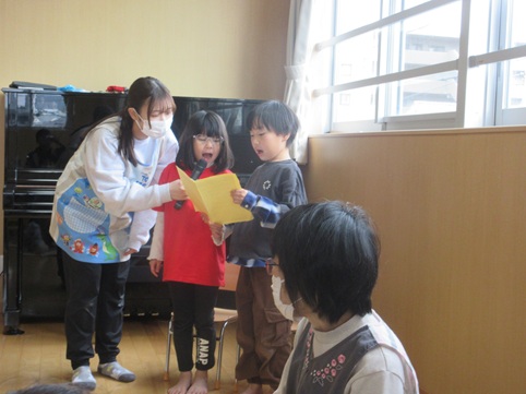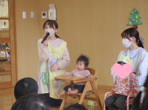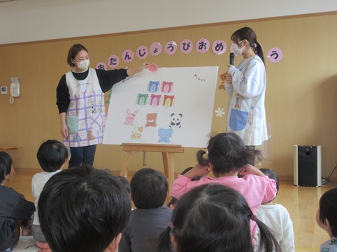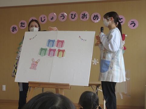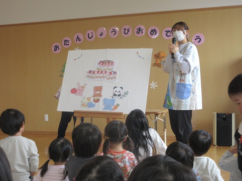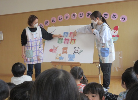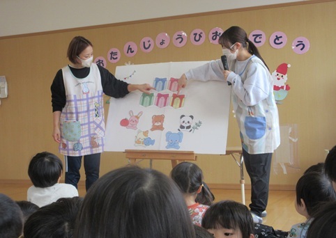 先生たちからのプレゼントは「だれのプレゼント」のパネルシアターでした