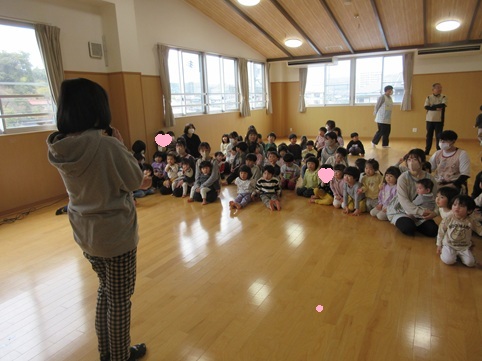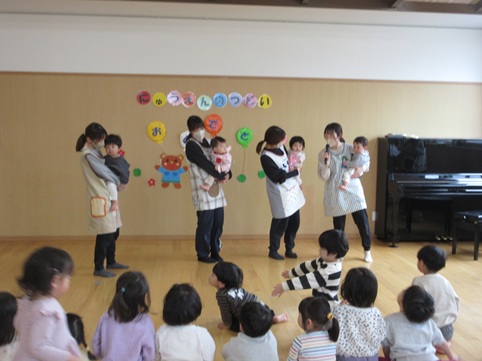 新しいお友だちの紹介もしました。残念ながら一人お休みのお友だちがいましたが、初めての集会でも先生にだっこしてもらい、安心し、笑顔も見られました。